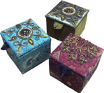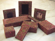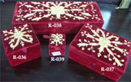 We specialize in Boxes and Picture Frames embellished with intricate zardozi embroidery and trims. These are available in vast array of sizes and designs and the Boxes are great for packing expensive gifts or to organize your own jewellery in style. A small selection of our Gift/Jewellery Boxes & Picture Frames is pictured below: